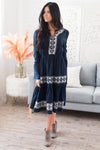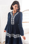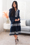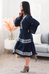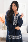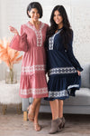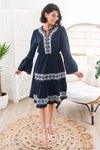 The Camilla is seriously one of the most gorgeous dresses we've ever seen! Featuring a gorgeous dark navy blue color, linen texture, beautiful ivory aztec embroidery on the sleeves and skirt, long bell sleeves, and a ruffled neckline! Make sure to get yours soon!