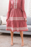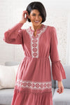 The Camilla is seriously one of the most gorgeous dresses we've ever seen! Featuring a gorgeous blush pink color, linen texture, beautiful ivory aztec embroidery on the sleeves and skirt, long bell sleeves, and a ruffled neckline! Make sure to get yours soon!