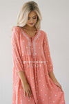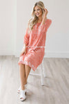 Embroidery details our are favorite! This adorable, Spring and Summer perfect dress, has a tie detail neckline, loosely gathered empire waist, a flowy fit and cute white embroidery details. Lined.