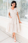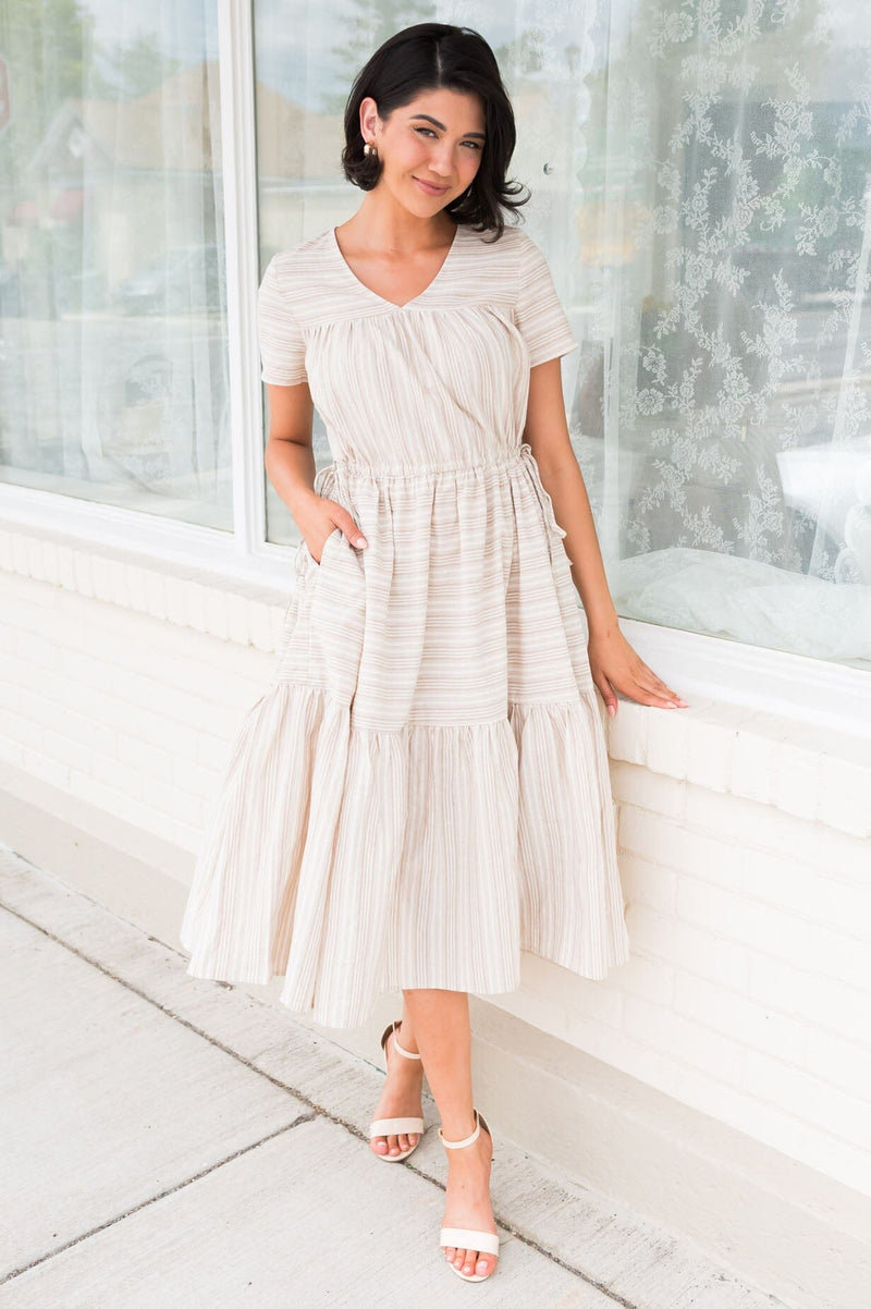 Be prepared to be amazed! This darling Carlina dress is so flattering and fun! Featuring the most gorgeous taupe & natural striped material, short sleeves, pockets, and the most flattering drawstring side tie detailing. Get this feminine beauty today!