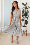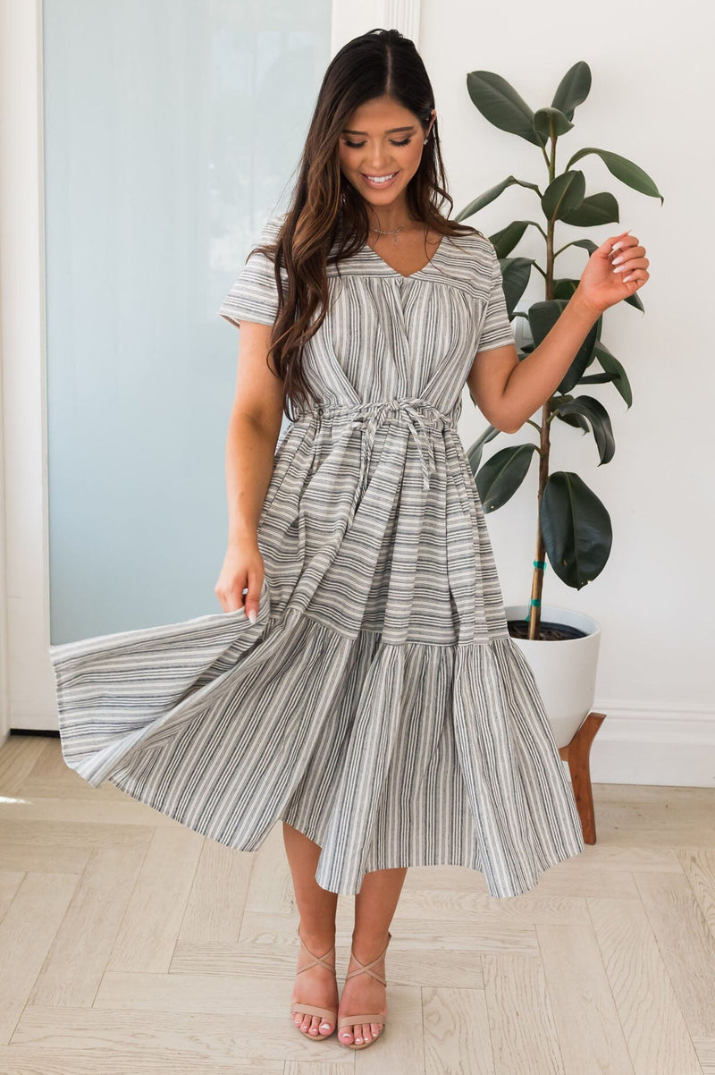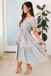 Be prepared to be amazed! This darling Carlina dress is so flattering and fun! Featuring the most gorgeous black & natural striped material, short sleeves, pockets, and the most flattering drawstring side tie detailing. Get this feminine beauty today!
