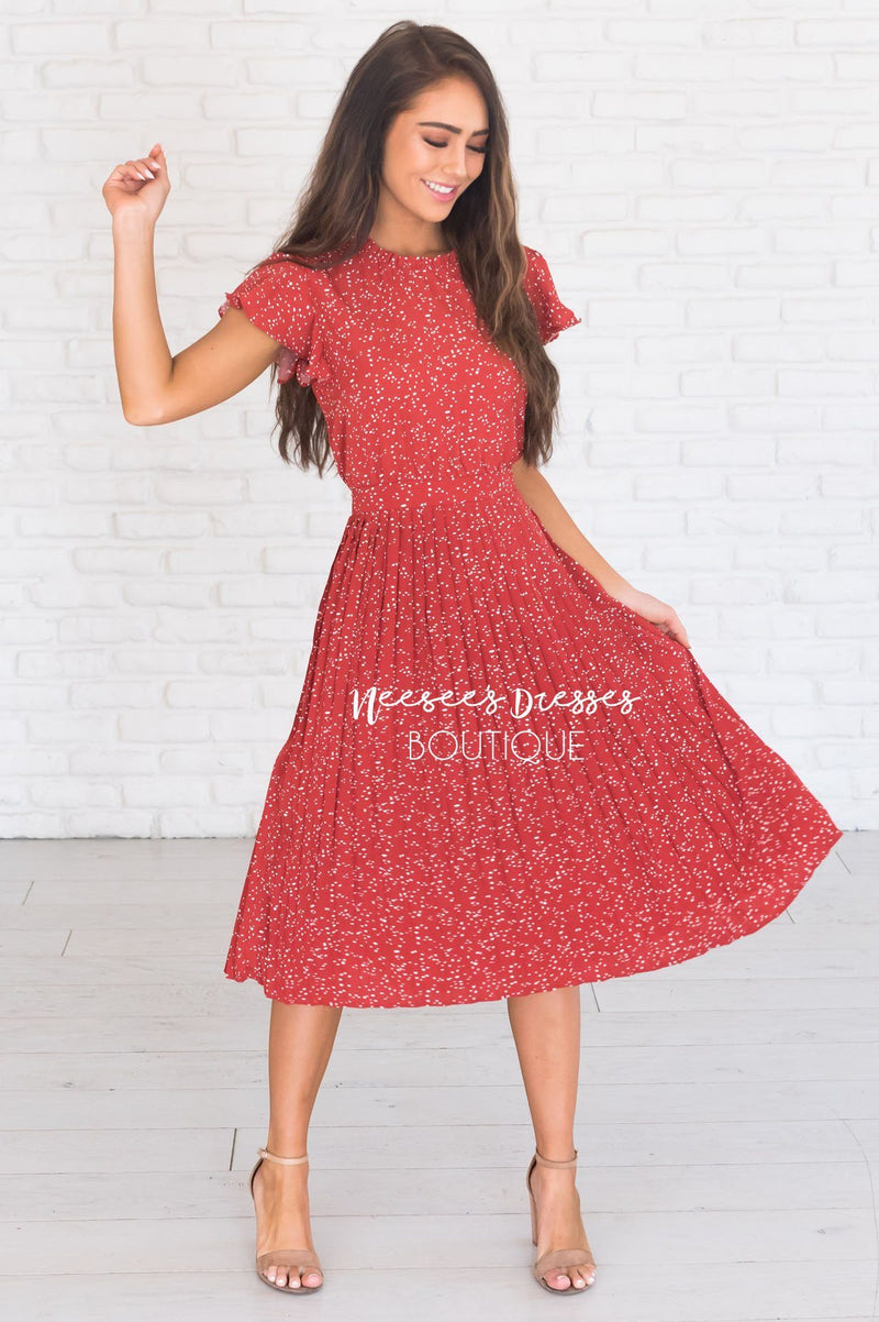 The New Carlyn is a must have! The lovely feminine pleated detail throughout this gem is to die for! We simply can not get over all the darling details! Modest ruffle collar neckline, flowy short flutter sleeves, belt tie waist, and last but not least a full lined pleated skirt. Get yours before it's gone!