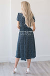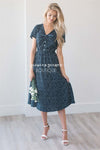 We have found our new favorite polka dot dress! This navy polka dot features a faux button front, a tie neck, short flutter sleeves and an elastic gathered waist.