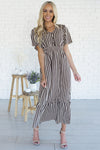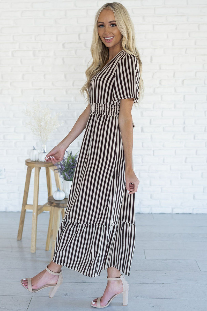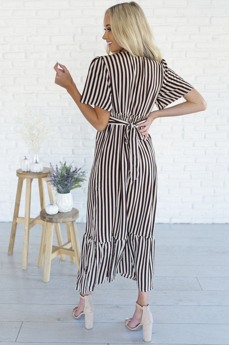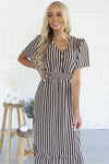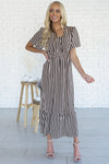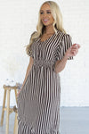 The Cathy is here and ready to make all your what to wear days a simple choice! Always grab for this beauty! It's perfect for all seasons and occasions! We are loving the soft flowy fabric, short flutter sleeves, soft v-neckline with functional button front detailing, shirred elastic waist with belt tie and gorgeous ruffle hem!
