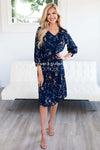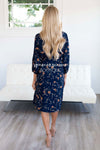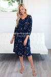 This dress is beyond beautiful and features all the details you have been searching for! Stunning navy dress features a subtle rust floral print, 3/4 length sleeves, a conservative v neckline, functioning buttons down the front and a waist tie for the most flattering fit. Dress is fully lined.