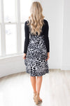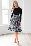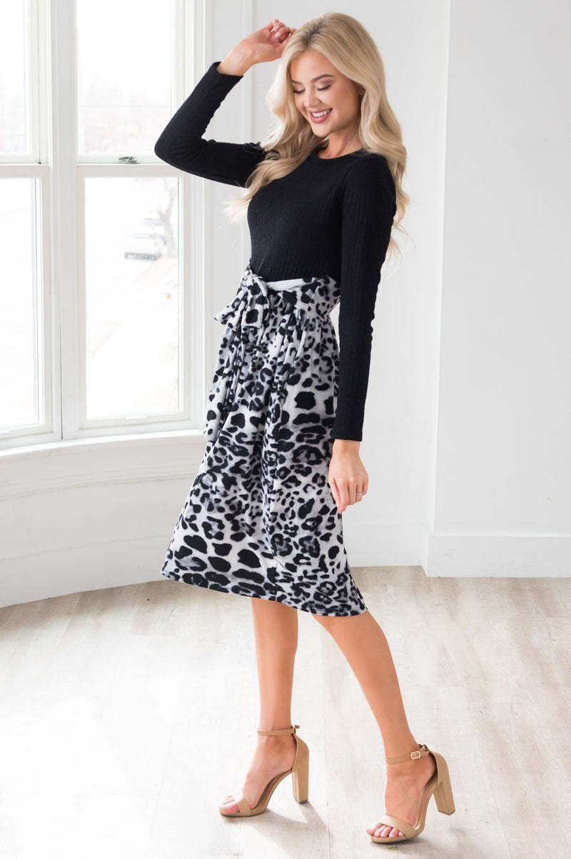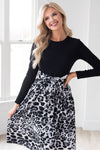 The new Chanda is the perfect style, fit and feel! Trust us, you are going to want this super soft, cozy and on trend dress! We are loving the modest round neckline, fitted long sleeves the ribbed bodice material. It pairs perfectly with the snow leopard print skirt. This dress also features the ever popular belt tie waist and pockets. Get yours today!