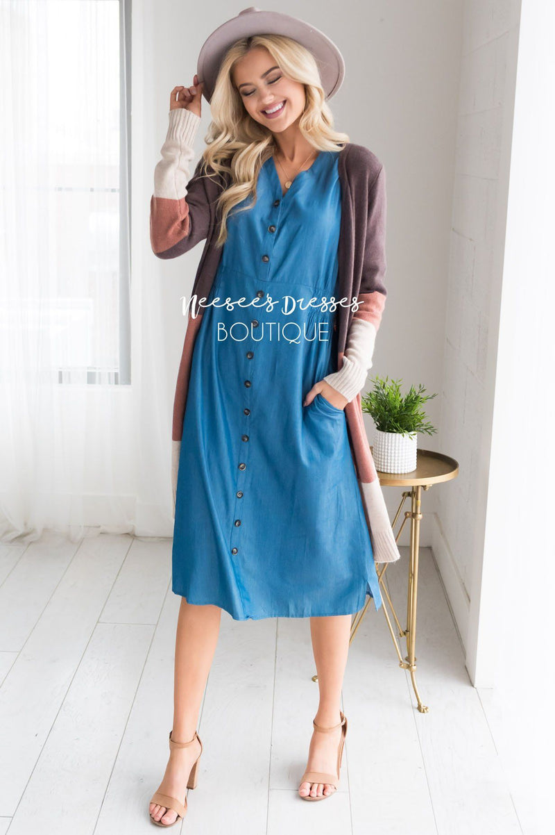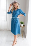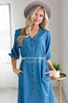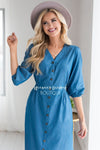 This timeless dress is a must have for everyone! Dress is up with your favorite accessories and heels or keep it casual with your favorite sandals or sneakers, wither way you cannot go wrong with this one! Blue Denim dress features a v neck line with functional button bodice, puffed 3/4 length sleeves a fitted waist. This dress is also nursing friendly.