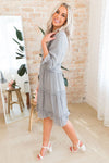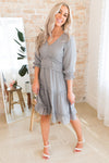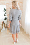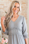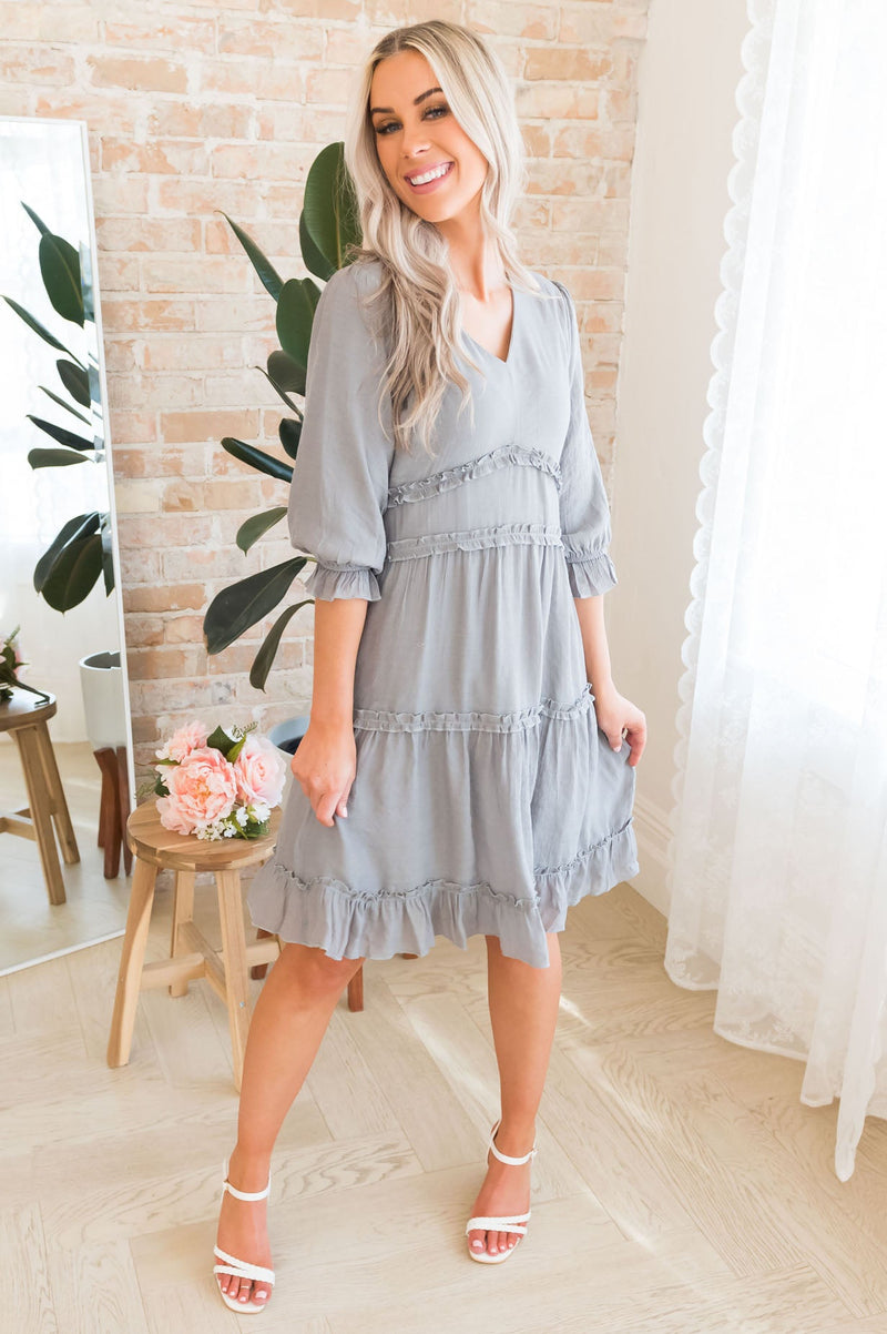 This darling little ruffle dress is so elegant and feminine! We are loving the modest v-neckline, gorgeous light grey color, 3/4 length puff sleeves and the most gorgeous ruffle tiered detailing throughout the waistline and tiers skirt. Get yours today because these beauties will go fast!