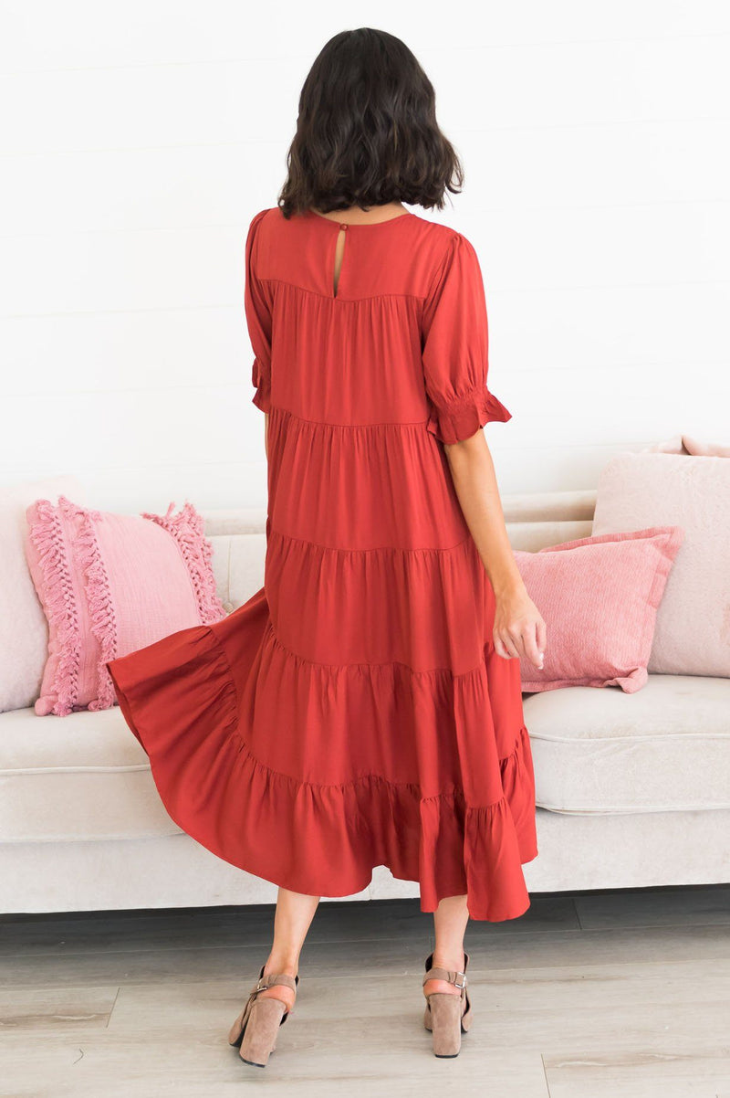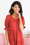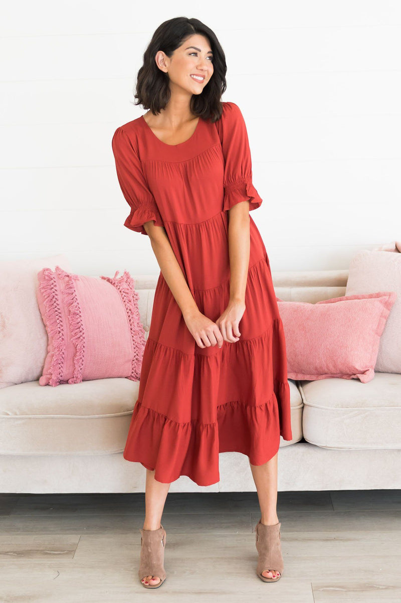 The new Charlie has arrived! So comfy and cute, there is no way you could go wrong with this dress! Perfectly designed for any occasion, this gorgeous rust colored dress features a rounded neckline, half length bell sleeves and a tiered ruffle hem skirt. Get yours soon!