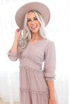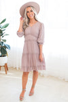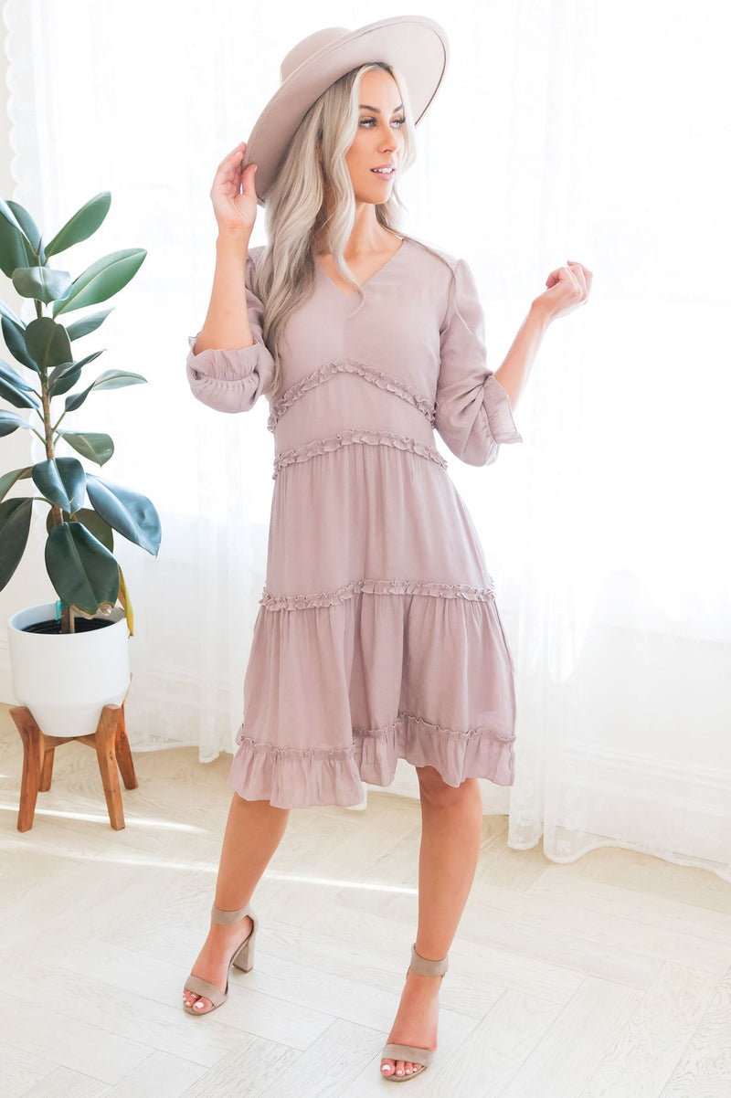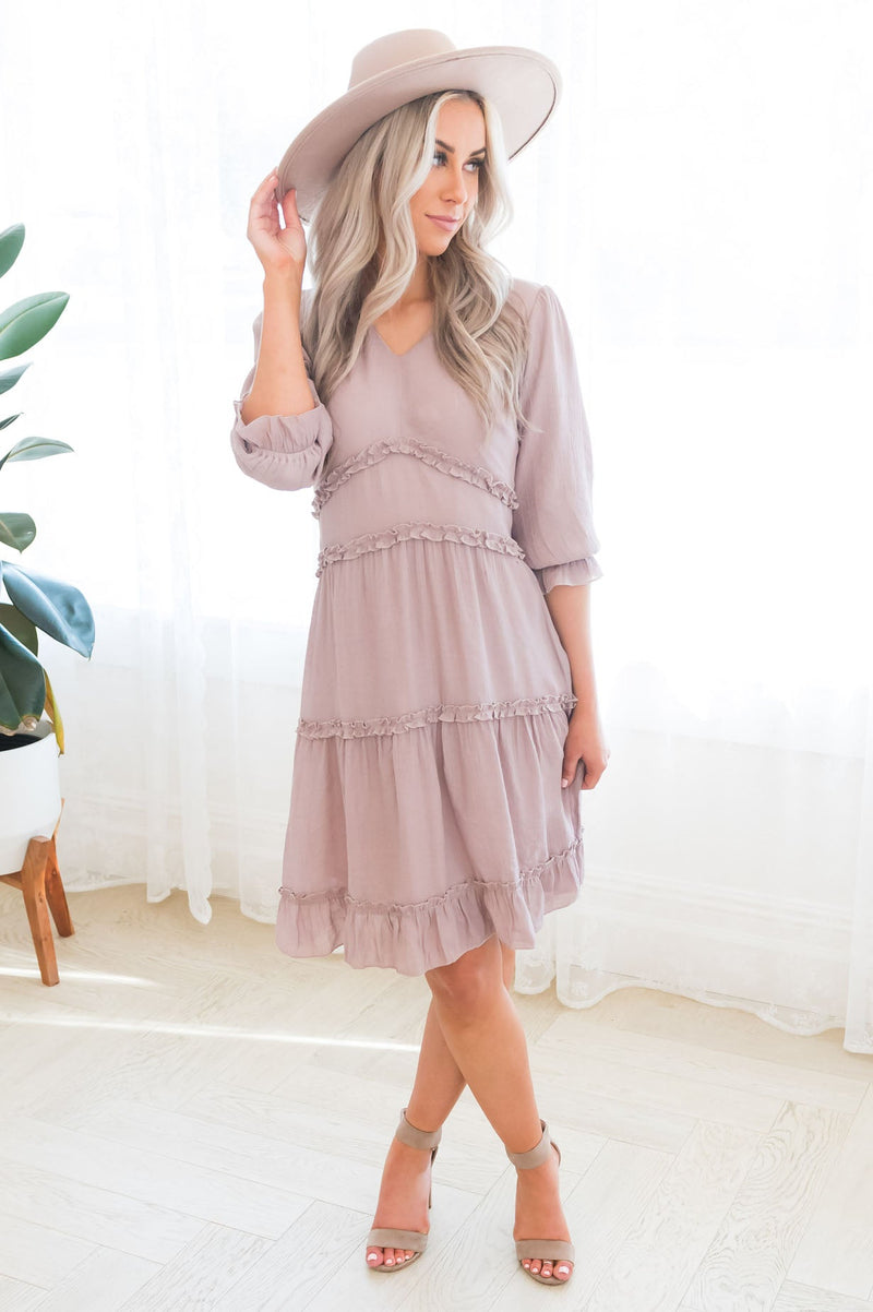 This darling little ruffle dress is so elegant and feminine! We are loving the modest v-neckline, 3/4 length puff sleeves and the most gorgeous ruffle tiered detailing throughout the waistline and tiers skirt. Get yours today because these beauties will go fast!