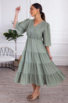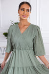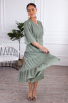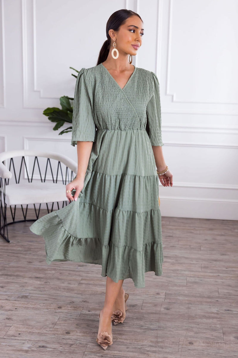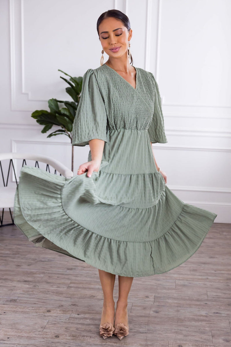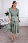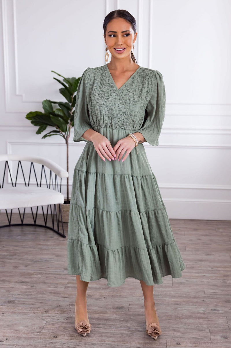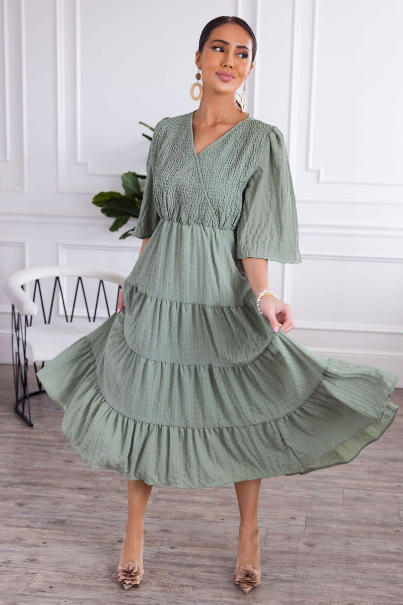 The Charlise modest dress is perfect from top to bottom! We adore this gorgeous botanical green color, cross-over neckline with smocked bodice, half length sleeves and flowy tiered skirt! This darling dress is seriously perfect for any season, grab yours today!