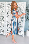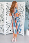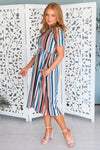 Brand new and ready to be a closet addition! Get the darling striped Chelsy today, before it's gone! Features include flattering stipes in the perfect color combo, short sleeves, stretchy empire waistline and our favorite length skirt. Act fast and click to cart now!