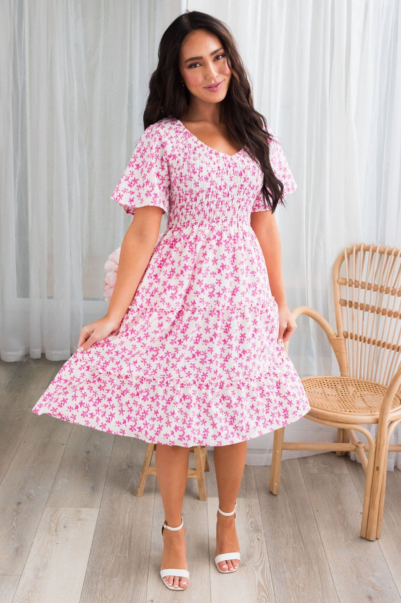 The lovely ruffled Cheyanna has arrived and trust us when we say you must have this beauty! The darling floral and tiered midi skirt are the perfect combination. Not to mention the flattering smocked bodice & short flutter sleeves. Get yours today!