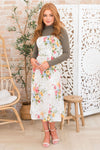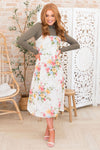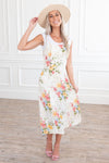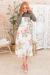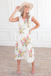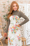 This modest floral jumper style dress has stolen our hearts! We are obsessed with the lovely yet oh so delicate color combination! Features include tie shoulder straps, fitted bodice and the perfect length skirt. Get yours today! *Undershirt not included