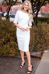 Keep your holiday season classy and sophisticated in this stunning new dress! This dress is perfect for any occasion from family Christmas dinner to the New Years Eve ball drop. Either way this dress will be sure to turn heads! Features a perfect pencil fit, a scoop neck line, half sleeves and an embellished beaded detailing along the sleeves. This dress is also lined and features a back zipper.