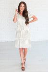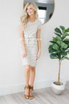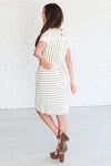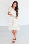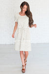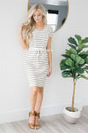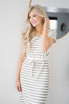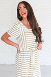 The Christy is hands down the cutest little summer dress. Dusty sage and cream stripes dress featuring contrasting horizontal and vertical stripes and an elastic, draw string waist.