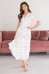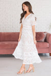 The Ciarra is here, and we know you will love it! This is the absolute perfect lace dress, it's so classy and feminine, this is your dress for any event on your agenda! Featuring white lace overlaying gorgeous beige lining, a soft V-Neck, fully functional bodice front buttons making this dress nursing friendly. Stunning lace sleeves, an banded waist, and the most beautiful lace detail hem! Get yours today! This dress is fully lined.
