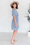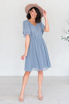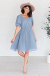 Elegant, classy and oh-so-beautiful! Our timeless Claire dress is now in a textured fabric and a beautiful shade of dusty slate blue! It features an elastic waistband, soft V neckline, and gorgeous tiered fluttery sleeves. Wear it to Sunday Church, or add a flower crown or belt for the perfect bridesmaids dress!