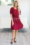 The Claire is the perfect shade of burgundy for this fall season! A beautiful chiffon dress with an elastic cinched waist, soft V neckline, and gorgeous tiered sleeves!