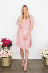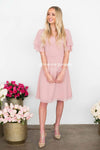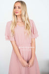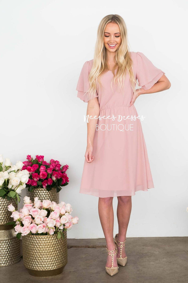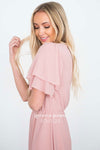 Elegant, classy and oh-so-beautiful! Our timeless chiffon Claire Dress is beautiful shade of dusty pink with an elastic waist, soft V neckline, and gorgeous tiered sleeves!
