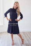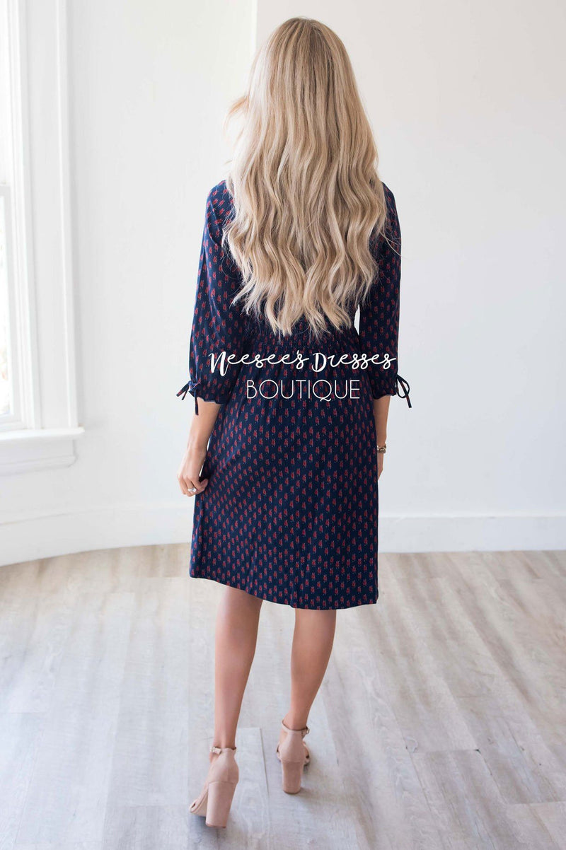 Pictures do not do this cute dress justice! The Claudia is as flattering as they come. Beautiful navy dress features a burgundy print, smocked neck and smocked waist, and 3/4 length sleeves with tie details.