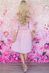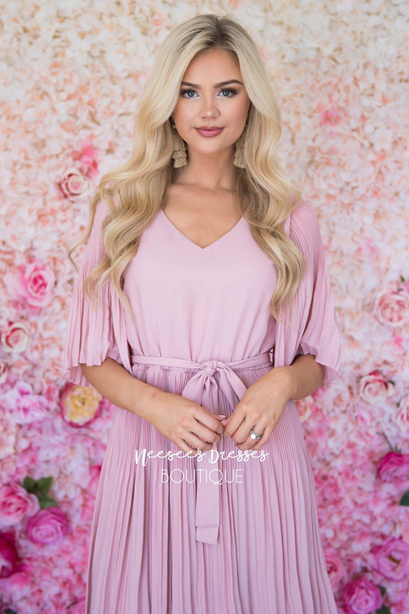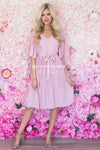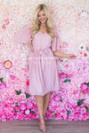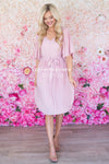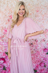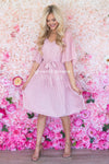 The Claudine features all the feminine details you have looking for! This pink dress features pleated details in the skirt and flutter sleeves, a v neck line and a sash tie waist. This dress is also lined.