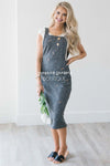This new overall dress has the cutest feminine touch! This dress features a charcoal color, tiny floral embroidered details, a back zipper and button clasp straps! Under shirt is sold separately.