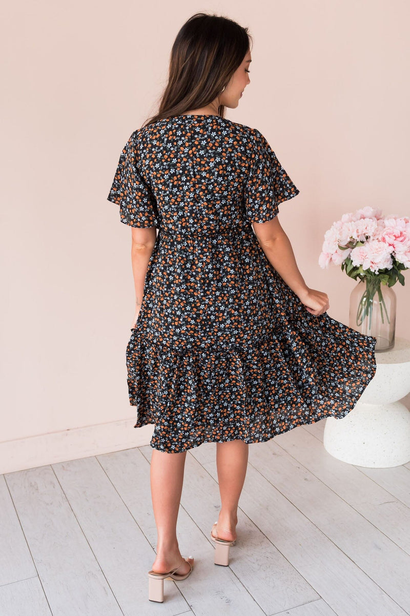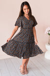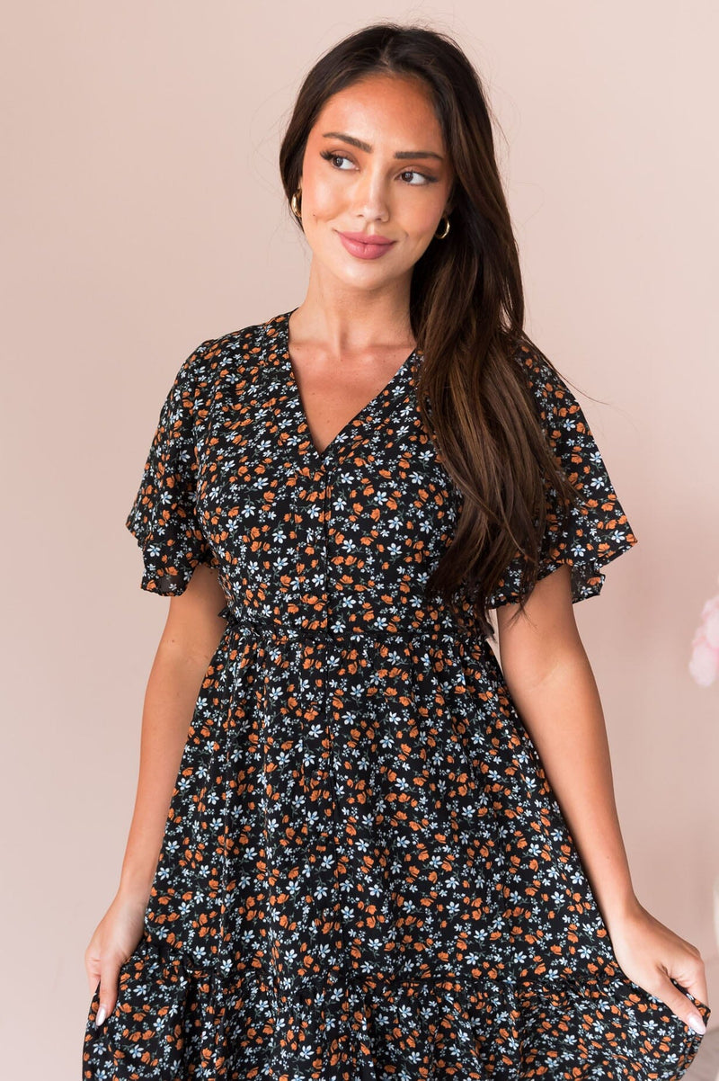 This lovely floral pattern dress is breathtaking! The functional button down front and pleated skirt this dress is absolutely perfect for any season! The soft V-neck and flowy skirt are fabulous from bottom to top!