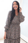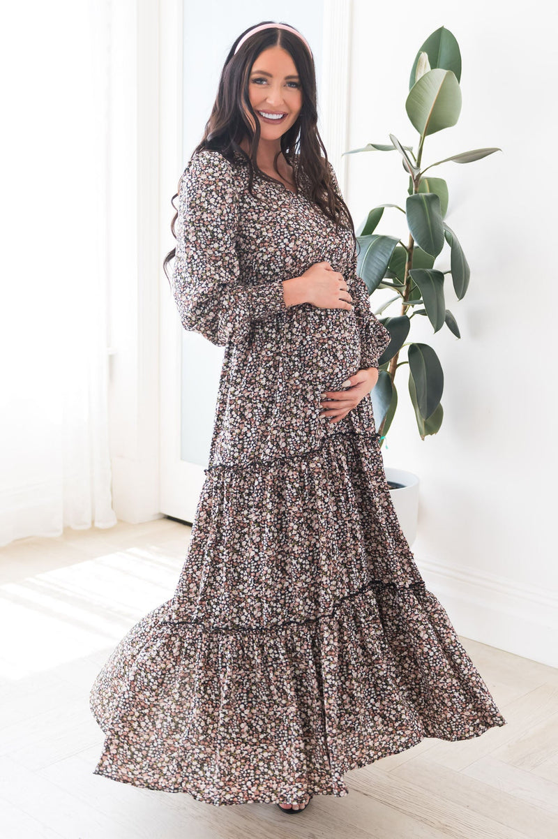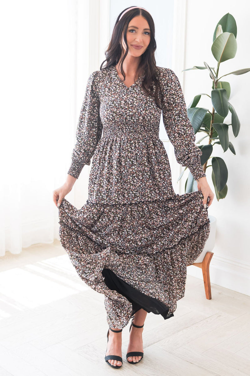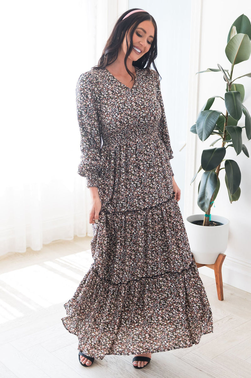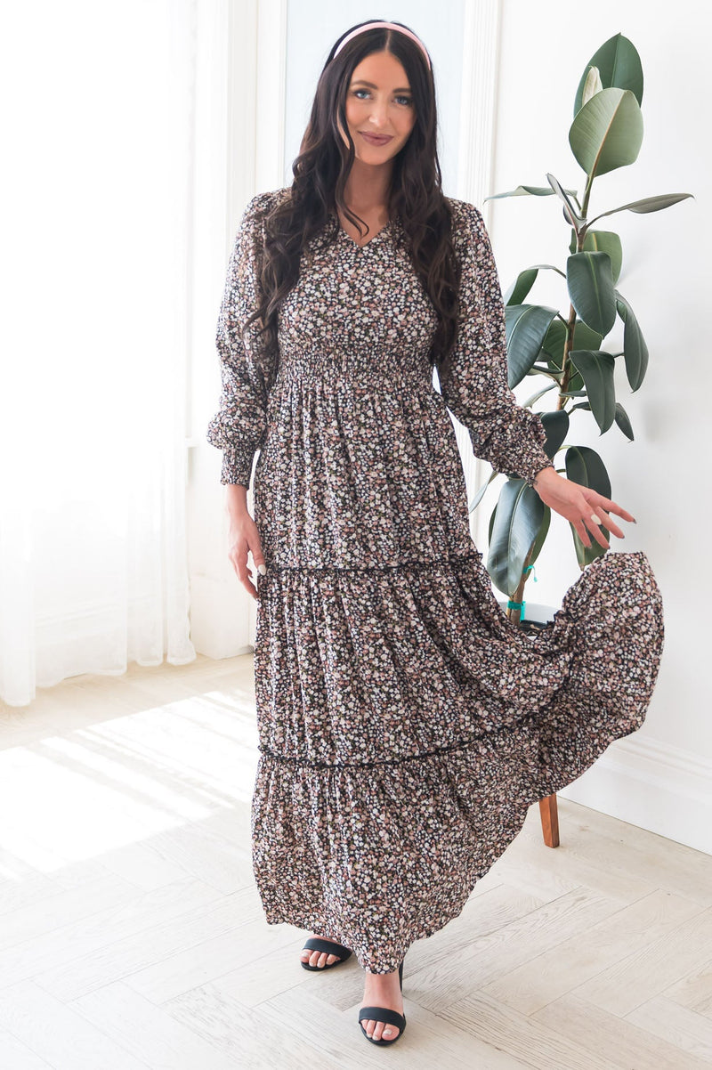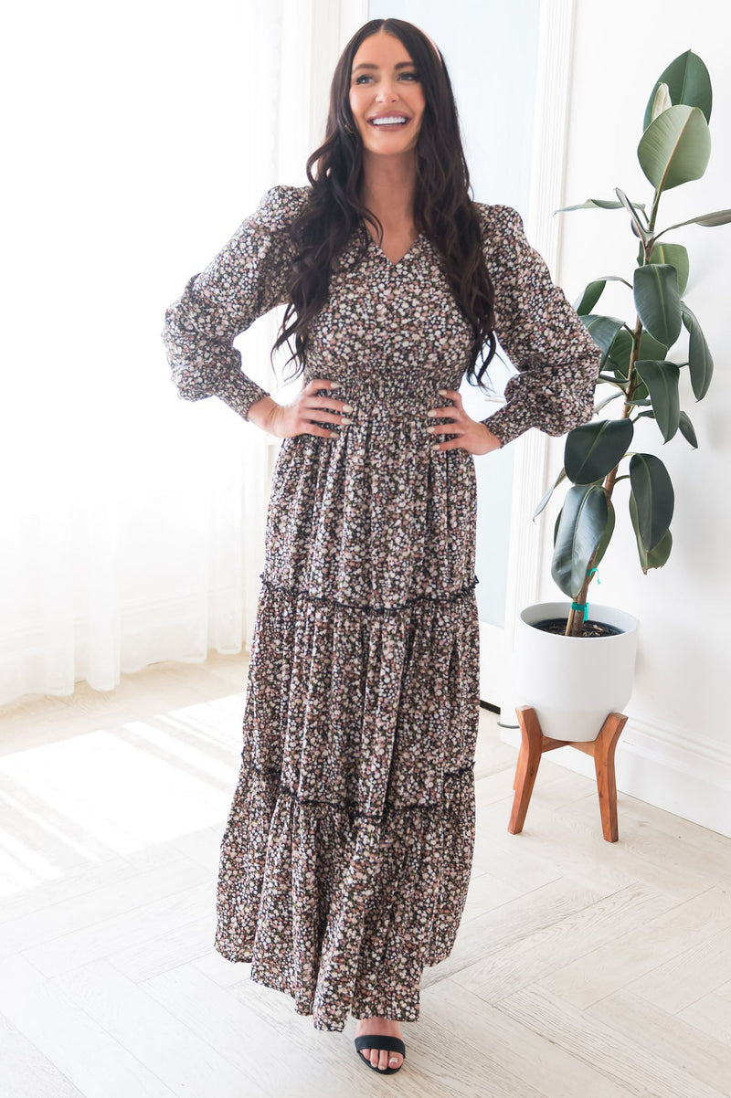 Our new Colette dress is absolutely stunning in every way! This dress features gorgeous long puff sleeves, modest V-neck, elastic ruffle waistline that gives this beauty some stretch, & tiered maxi skirt. This dress is so classy and elegant you will instantly fall in love with it!