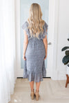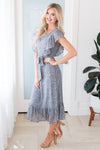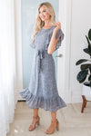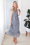 Let us introduce you to your new favorite dress! The Constance is the most beautiful modest gem, we simply can not get enough! Its features include the most darling pewter grey color, gorgeous dainty brown, navy, and light grey floral print throughout, belt tied waist, and a ruffled bodice, hem, and sleeves!! The Constance is seriously a must have for summer and fall!