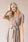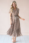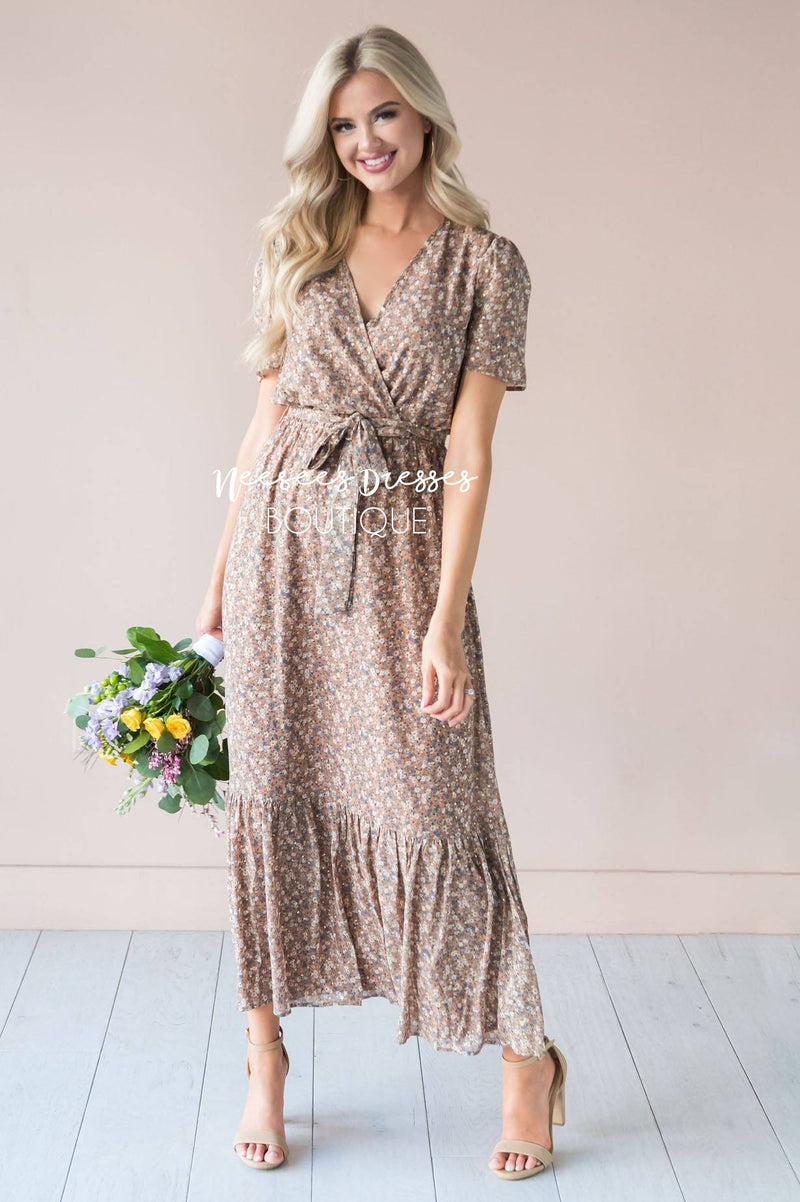 Our new Coretta dress is seriously perfection! We are loving the modest cross-body bodice, perfect for all you nursing mama's out there! Also featuring the most feminine unlined flutter sleeves & modest long ruffle hemline. This dress is also lined with the most darling floral gold shimmer material.