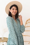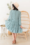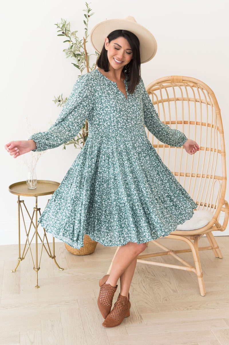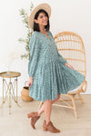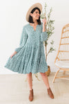 The gorgeous Corinna has arrived just in time for fall! We are loving the long sleeves, the beautiful ivory ditzy floral throughout, gorgeous dark sage color, v-neckline, and darling tiered babydoll fit! You can't go wrong with this one, get yours today!