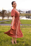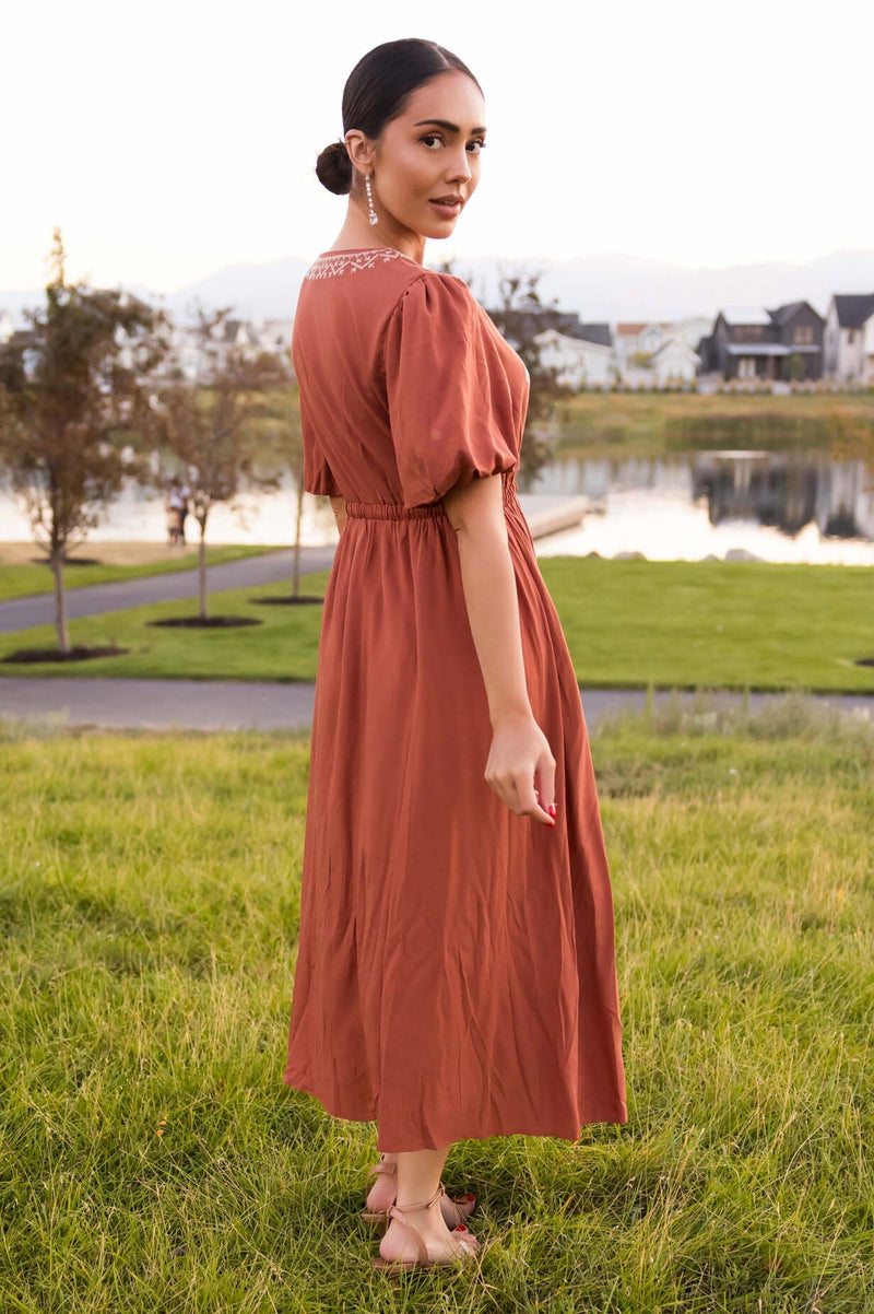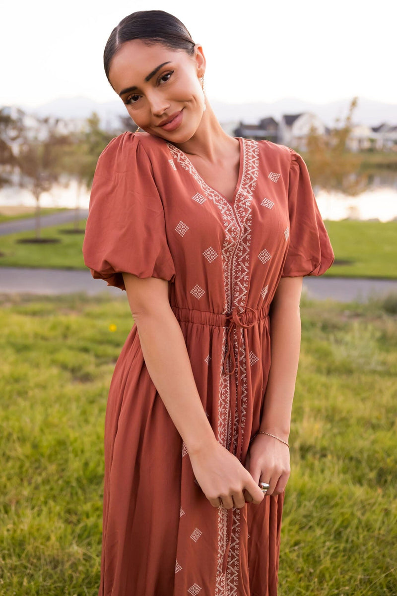 The Cortland is one of the classiest dresses we have ever seen! Twirl your way into any season or event with this lovely embroidered terracotta beauty. Featuring a modest v- neckline, short bubble sleeves, embroidery details throughout, elastic drawstring waistline, pockets and the perfect length flowy skirt.