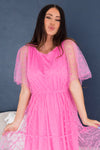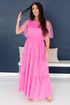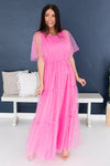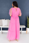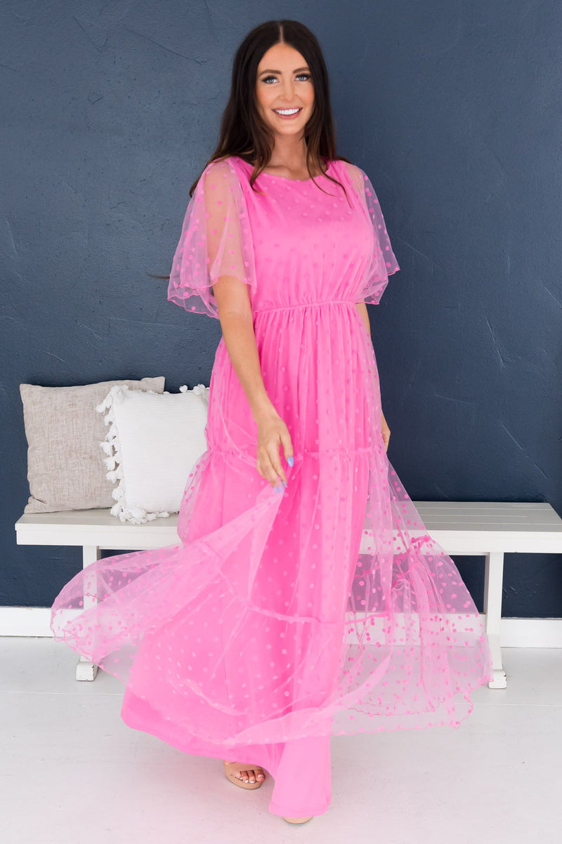 Our new Cortnie dress is classy, timeless, and oh-so lovely! We have never seen such beauty! It features a modest rounded neckline, beautiful dotted tulle, half length flowy unlined sleeves, and tiered maxi skirt. This dress is sure to sell out, so hurry and gets yours today