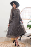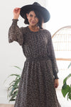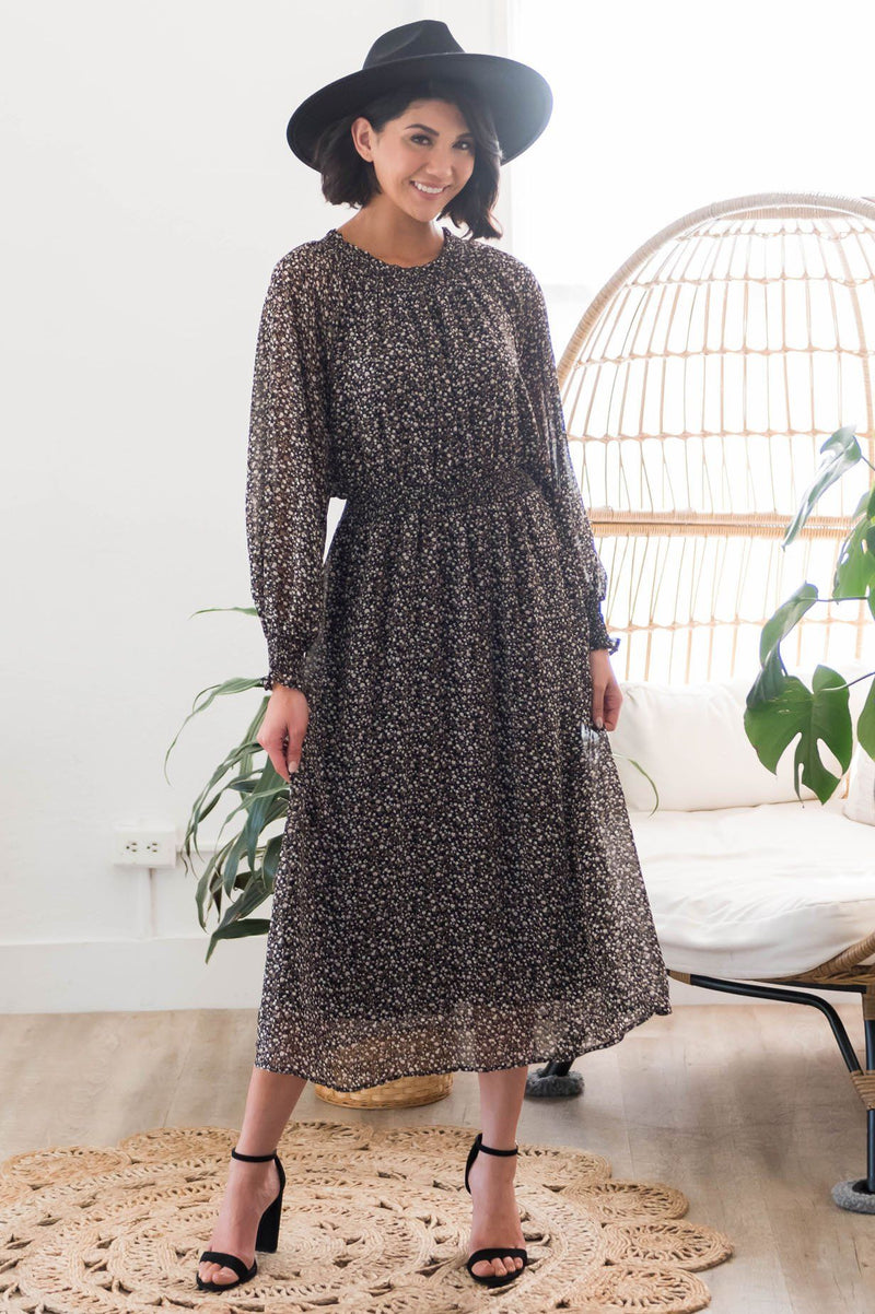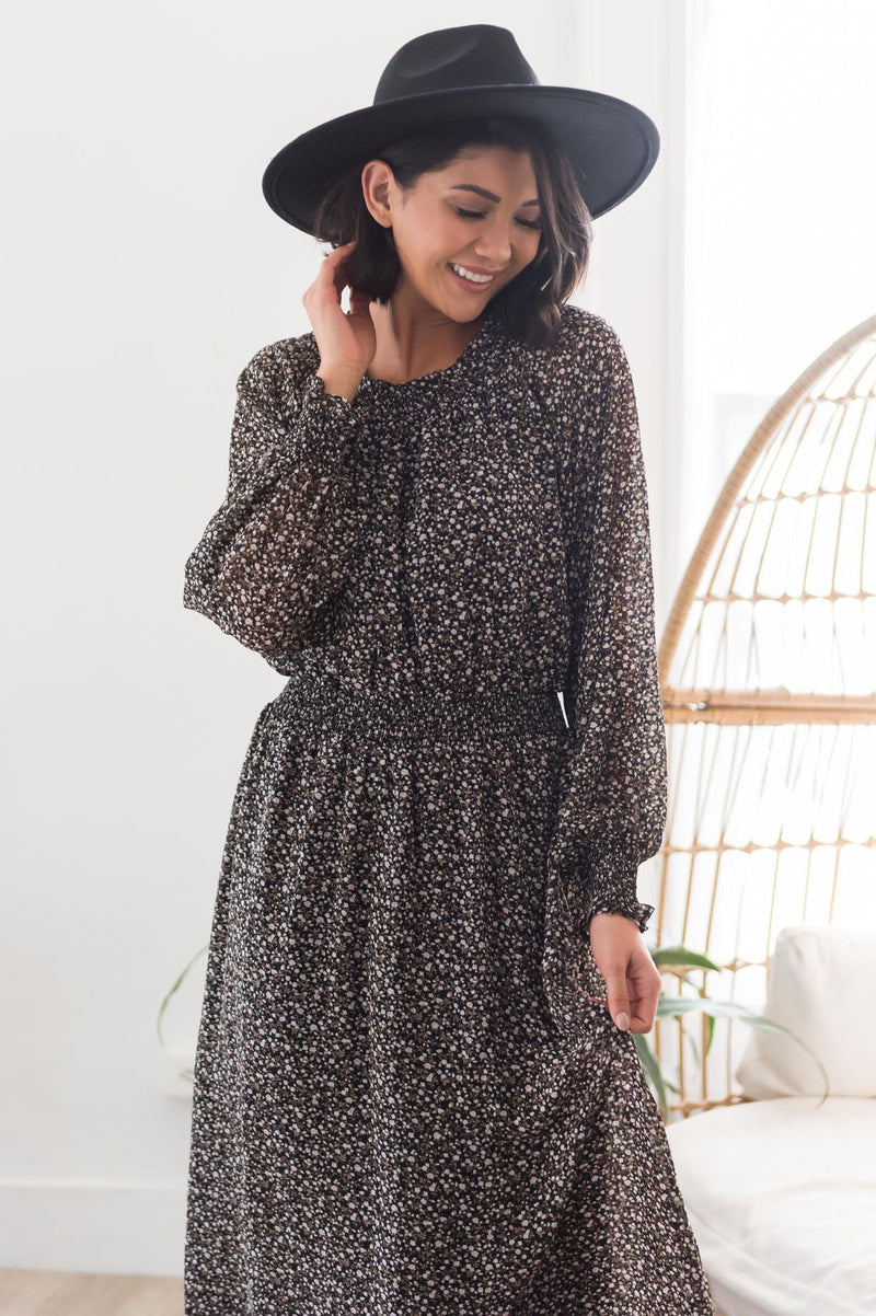 We are obsessed with this gorgeous floral dress! Featuring a gorgeous black base color, dainty ivory rose floral, chiffon texture, a smocked neckline, long sleeves with smocked hems, and an elastic waist! Make sure to get yours soon!