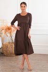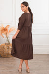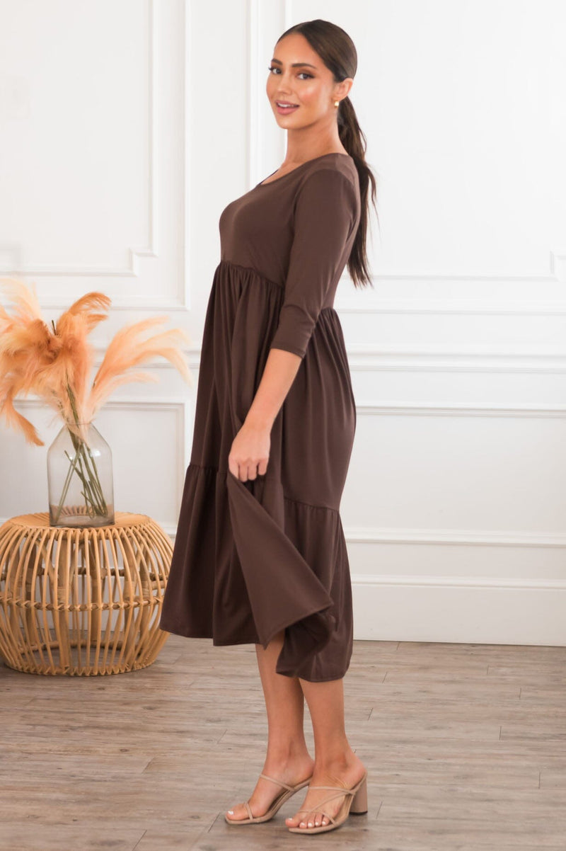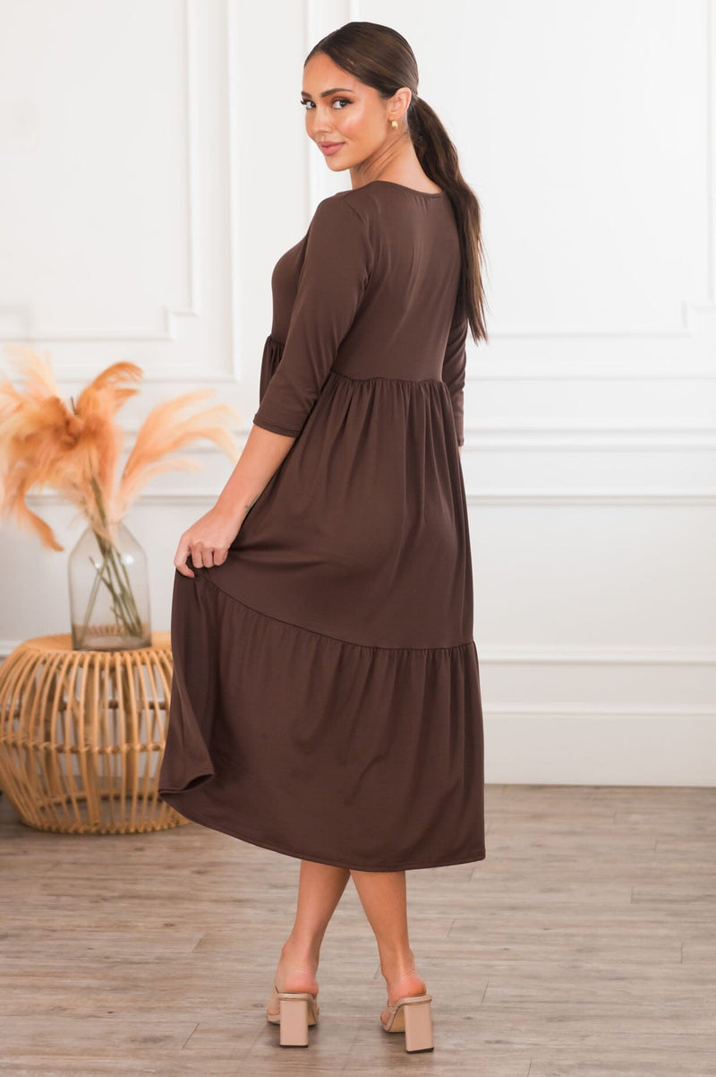 We cannot get enough of modest twirl worthy dresses! Especially ones in gorgeous solid colors! This classy dress features; fitted quarter length sleeves, scoop neckline, buttery soft material and a flowy ruffle hem skirt. These beauties are going to fly out of our boutique faster than they came in so be sure to snag yours!