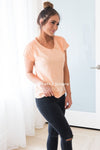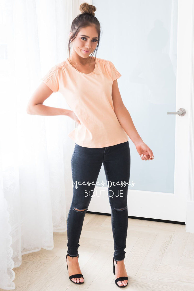 This delicate blouse is perfect day or night! Featuring gorgeous peach quartz color and a classy crochet neckline and shoulder detailing, it simply creates the softest feminine touch! Also features a darling short sleeves. Get yours today!