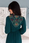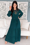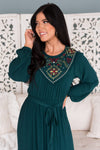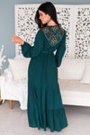 This dress is a must have for every single wardrobe! It is so feminine and classy! Features include our favorite emerald color with the most gorgeous floral embroidery, long sleeves, belt tie waist and a flowy tiered skirt. Get yours before these are gone!