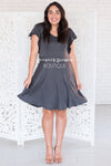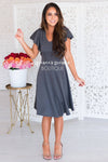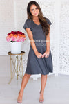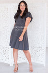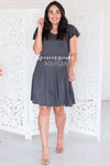 Spring perfection just arrived and you will not want to miss this one! We are obsessing over the simple yet feminine feel of this dress! Featuring a charcoal ponte fabric, a ruffle shoulder short sleeve,a rounded v neck line and fitted waist line.Get this color of the Daisie today!
