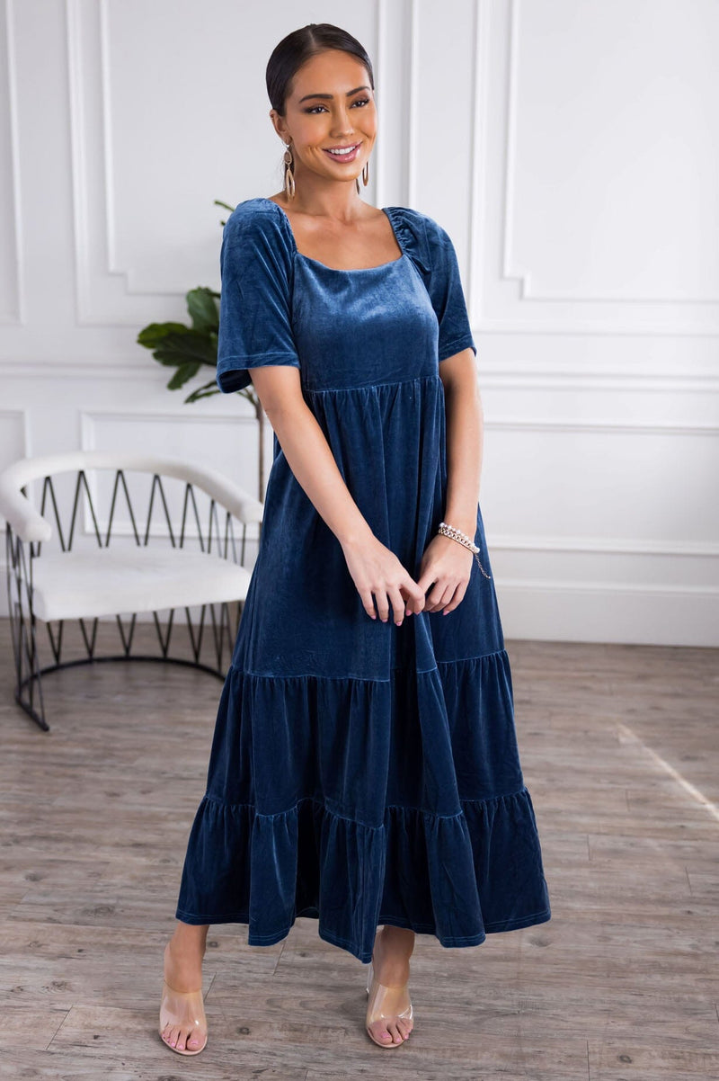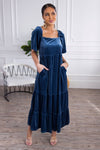 We have been waiting for a dress this beautiful for ages and it finally showed up! Sa hello to our new Danita dress. This beauty features; a beautiful florentine neckline, delicate flutter sleeve &, a gorgeous tiered swing style. Soft velvet fabric with beautiful colors. Do not miss out on this beauty.