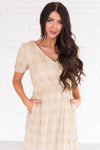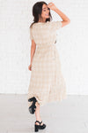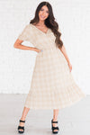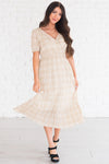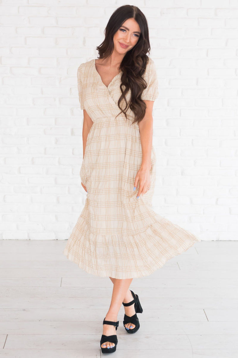 This fabulous maxi is a perfect addition to your summer wardrobe! The classic tan plaid pattern, cross bodice with button clasp, and darling puff sleeves this dress is oh so modest and perfect! We just adore the large ruffle design at the bottom of this skirt!