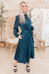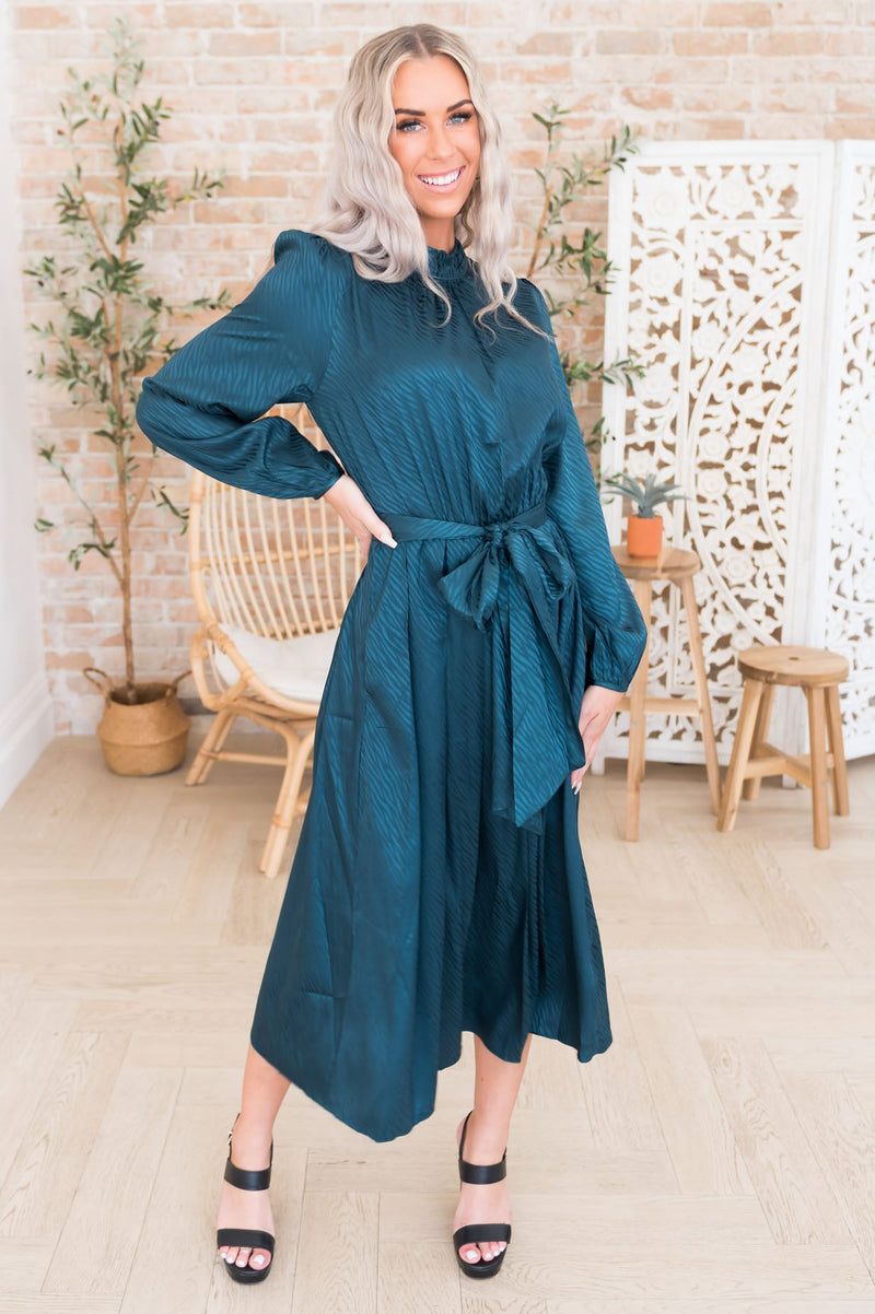 Add the new Darrelynn to our Fall wardrobe today! The lovely teal color is simply perfection for Fall! Features include darling modest tie neckline detailing, smocked waistline and flowy tiered maxi. Get yours today!