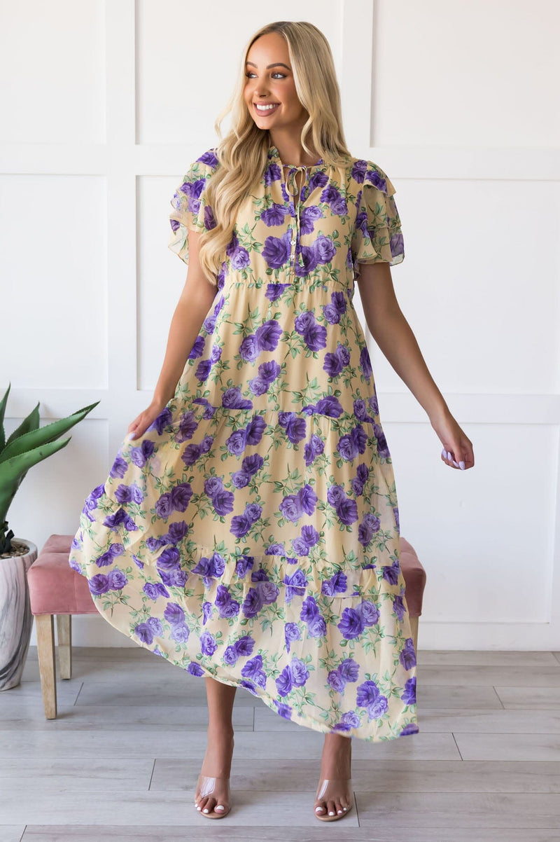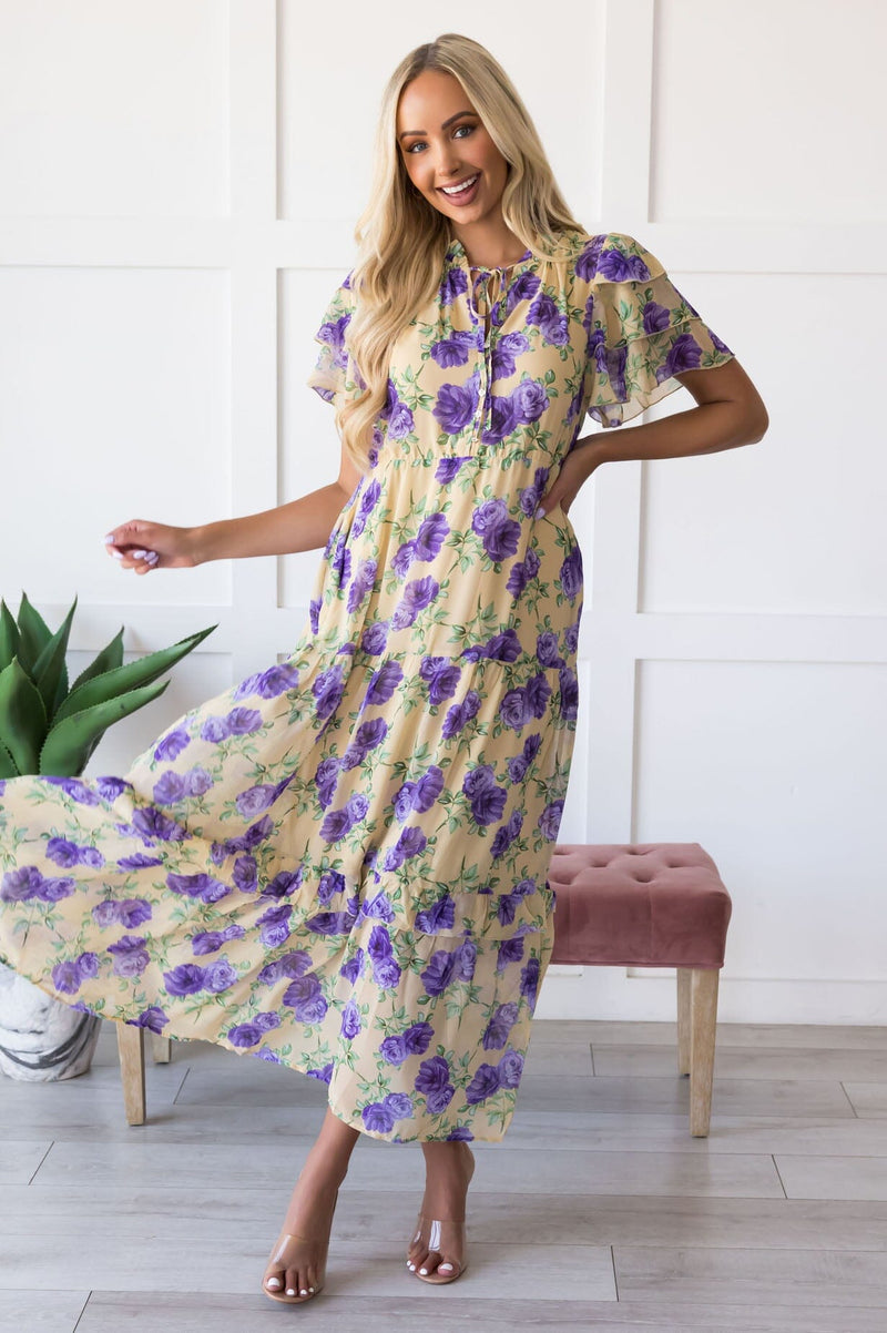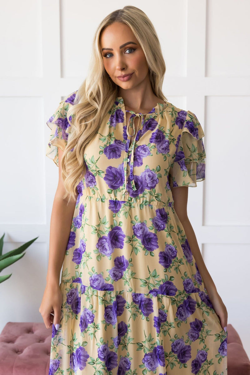 Add a pop of color and cuteness to your wardrobe with our new Daytona Dress! This adorable dress features triple ruffled short sleeves, necktie detailing with functional button front bodice and a feminine ruffle trim tiered skirt.