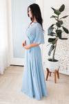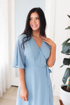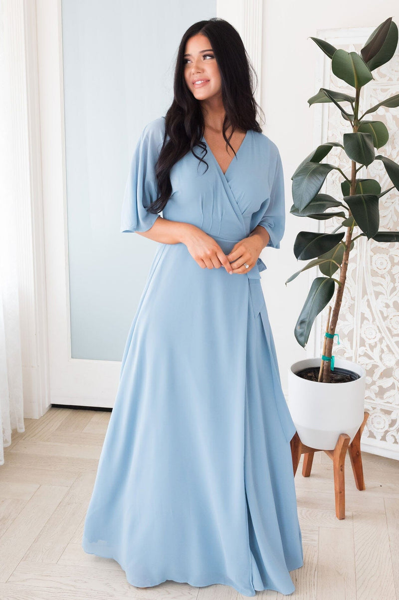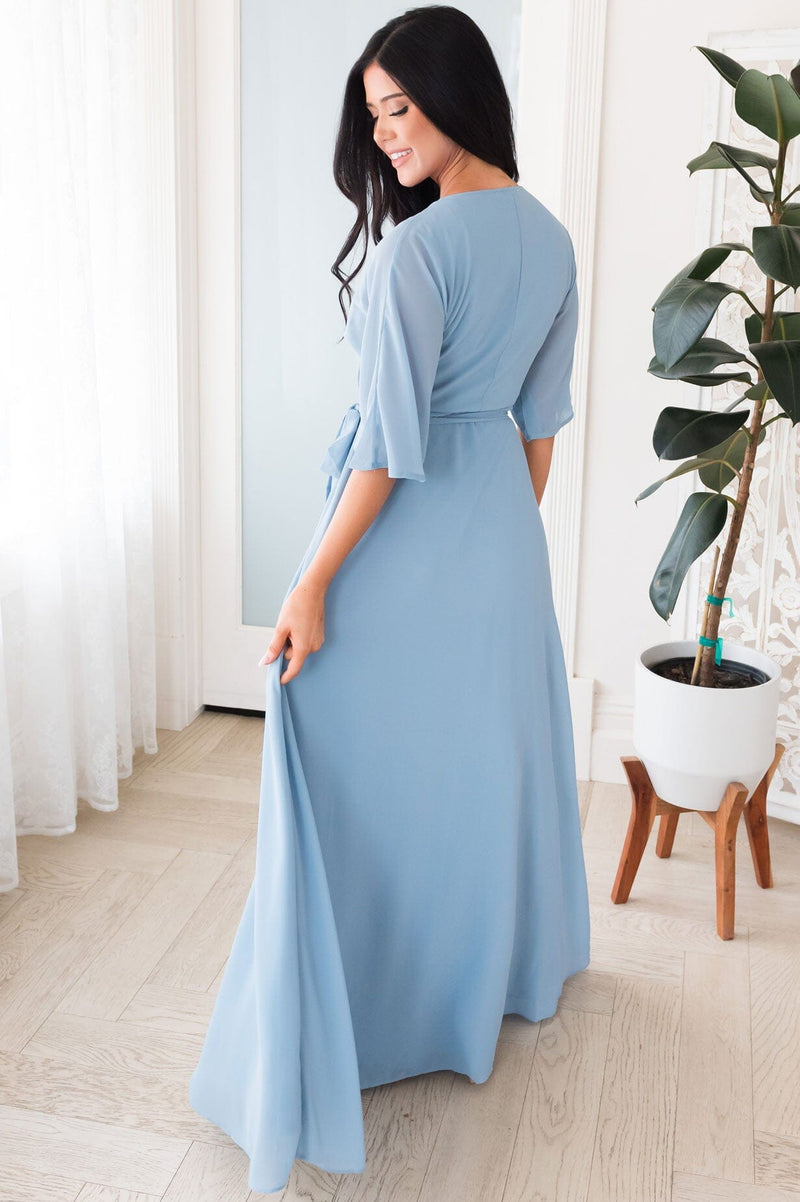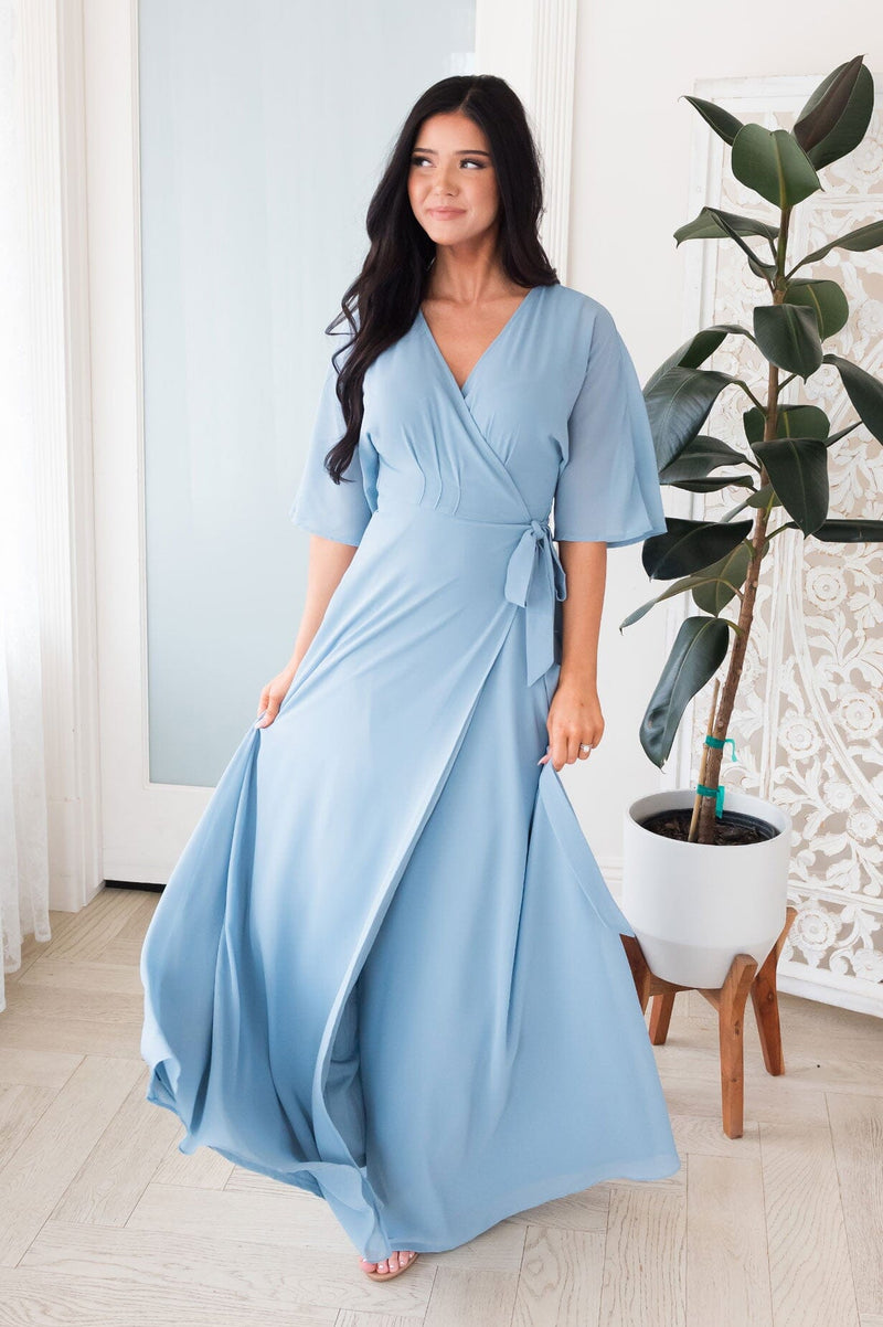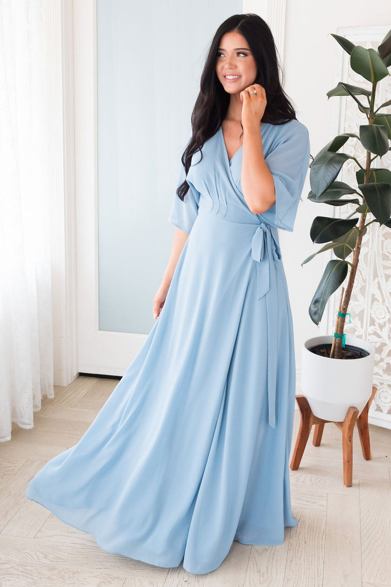 Meet one of the styles to our new Bridesmaids Collection! Our stunning Delaney Dress features half, flutter, chiffon sleeves, a beautiful cross over wrap style (making this dress nursing friendly), a flowy maxi and lined throughout except for the sleeves.