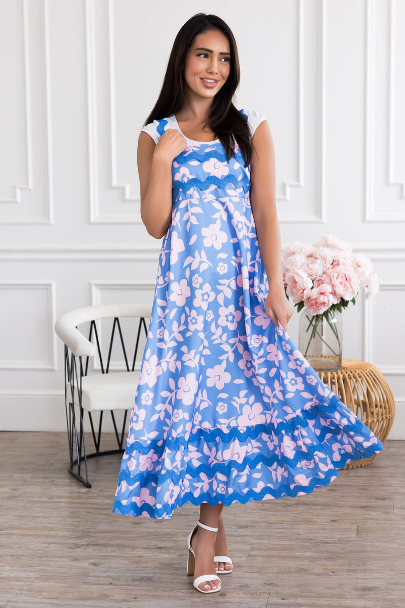 The Delphini brings all the joy! This cheery little jumper styles dress has stolen our hearts and we know it will yours too! Featuring a gorgeous floral print and the most darling blue trim throughout. Get yours today!