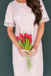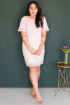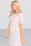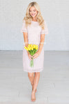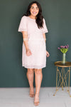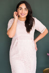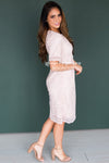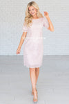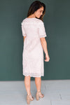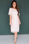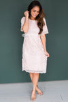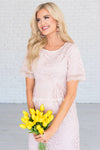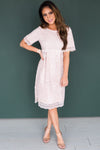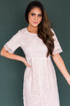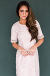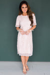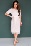 We are loving every beautiful detail about this new dress! This dress features a lace overlay with gorgeous modest detailing throughout, A rounded scoop neckline, fitted pleat waist, short sleeves and a back zipper closure. This one is a must have!