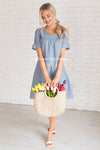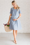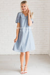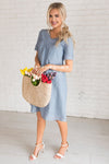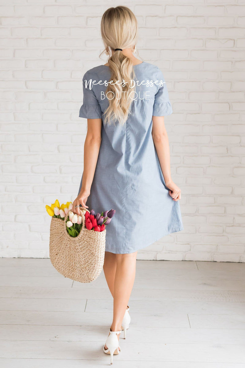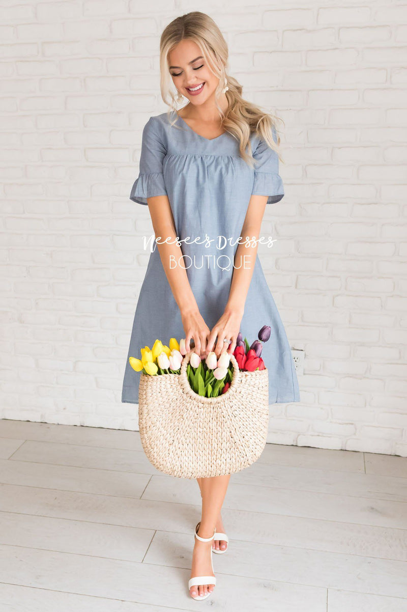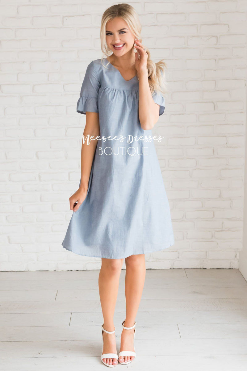 We simply adore this lovely little shift dress! The classy modest style is to die for! Featuring a perfect for anytime denim blue color, half ruffle sleeves add the perfect feminine touch, modest v-neck, back zipper closure and is fully lined. You will want this go to dress as soon as possible!