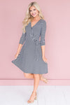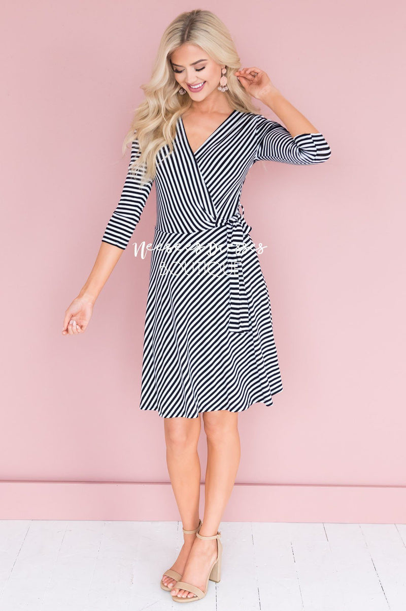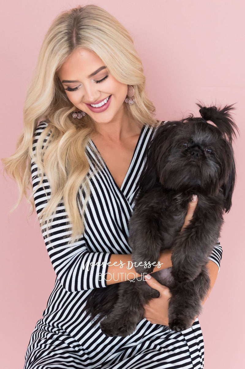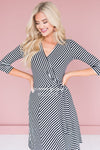 We are loving the gorgeous striped mid-length dress! So fun and classy at the same time. Featuring a faux wrap style with a belt tie waist, swing sty skirt and cozy striped material. The skirt is fully line and the beauty comes in 3/4 length sleeves. Get yours today!
