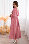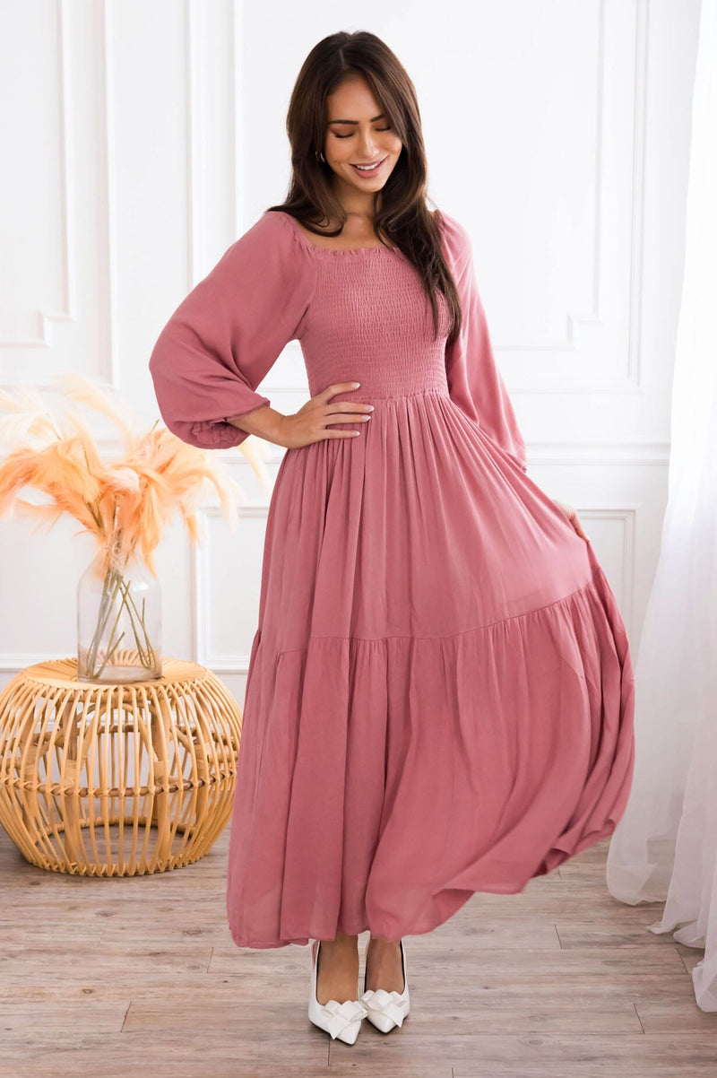 The Diana Ann is truly an elegant beauty! We are so in love with the gorgeous dusty rose color and perfect modest fit of this dress! Features include a slight squared ruffle neckline, half length puff sleeves and a gorgeous flowy tiered skirt, with a cute frayed ruffle. Get yours today!