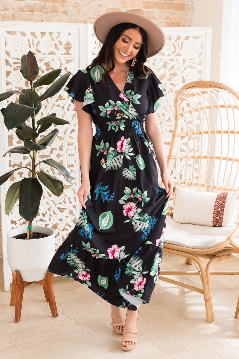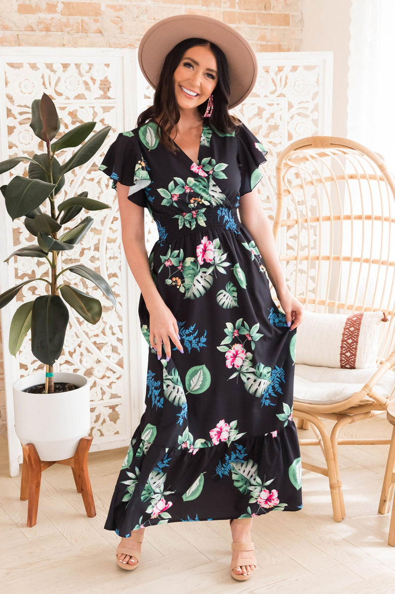 The gorgeous Dora Mae dress has arrived! Trust us when we say you are going to want to add to cart now because this darling dress will sell out quickly! Features include lovely tropical floral print, short sleeves and a ruffle skirt.